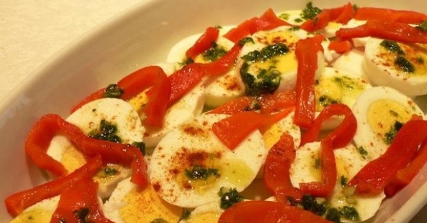 Yumurtaları haşlayıp soyduktan sonra dilimliyoruz ya da ortadan ikiye bölüp servis tabağına yerleştiriyoruz.Kırmızı biberlerimizi közlüyoruz.